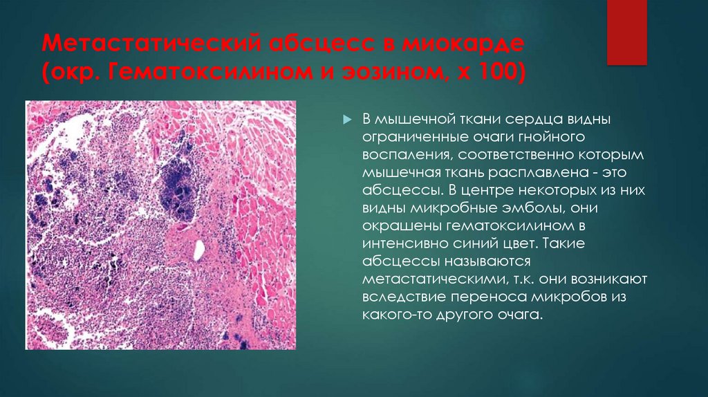 Метастатический абсцесс в миокарде(окр. Гематоксилином и эозином, х 100)