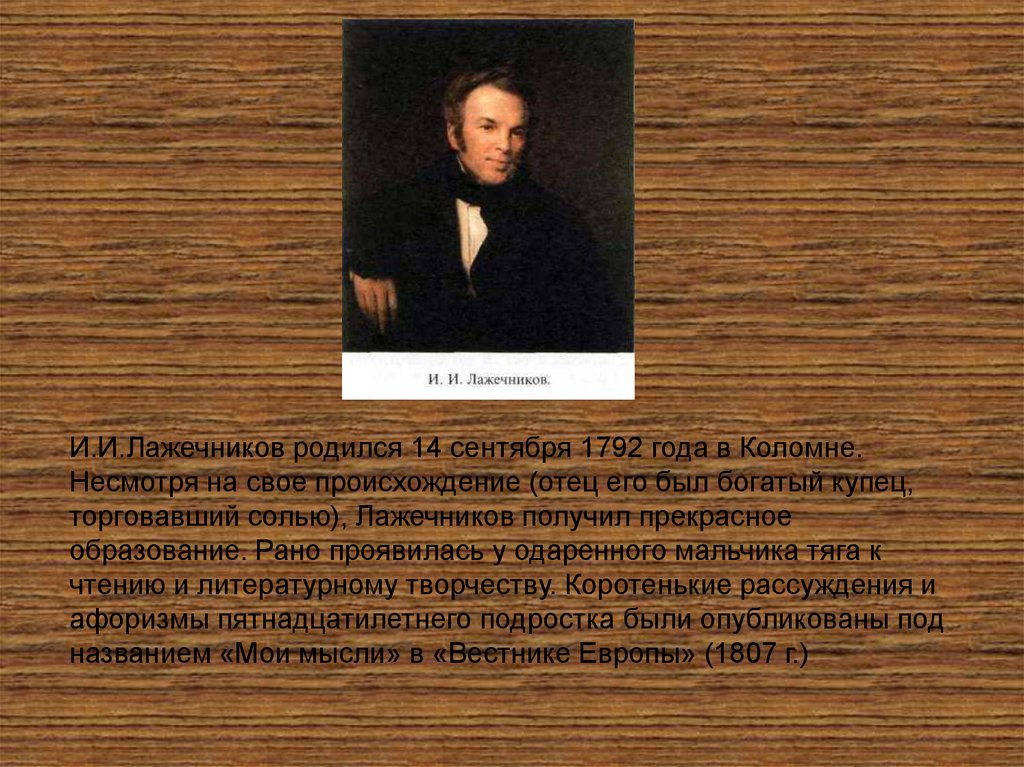 И.И.Лажечников родился 14 сентября 1792 года в Коломне.Несмотря на свое происхождение (отец его был богатый купец,
