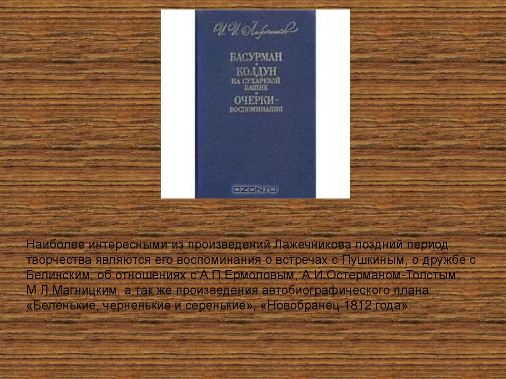 Наиболее интересными из произведений Лажечникова поздний периодтворчества являются его воспоминания о встречах с Пушкиным, о дружбе с