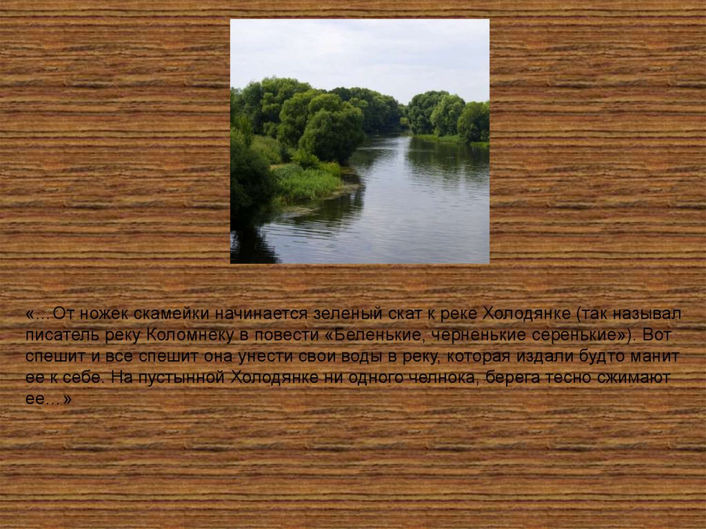 «…От ножек скамейки начинается зеленый скат к реке Холодянке (так называлписатель реку Коломнеку в повести «Беленькие, черненькие серенькие»). Вот