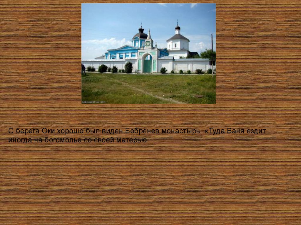 С берега Оки хорошо был виден Бобренев монастырь. «Туда Ваня ездитиногда на богомолье со своей матерью.
