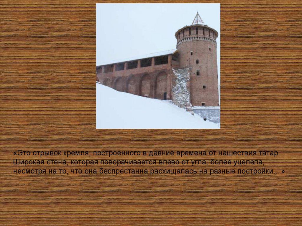 «Это отрывок кремля, построенного в давние времена от нашествия татар.Широкая стена, которая поворачивается влево от угла, более уцелела,