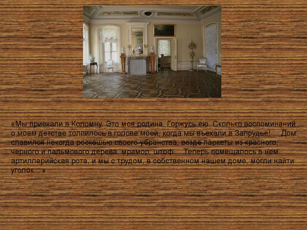 «Мы приехали в Коломну. Это моя родина. Горжусь ею. Сколько воспоминанийо моем детстве толпилось в голове моей, когда мы въехали в Запрудье! ... Дом
