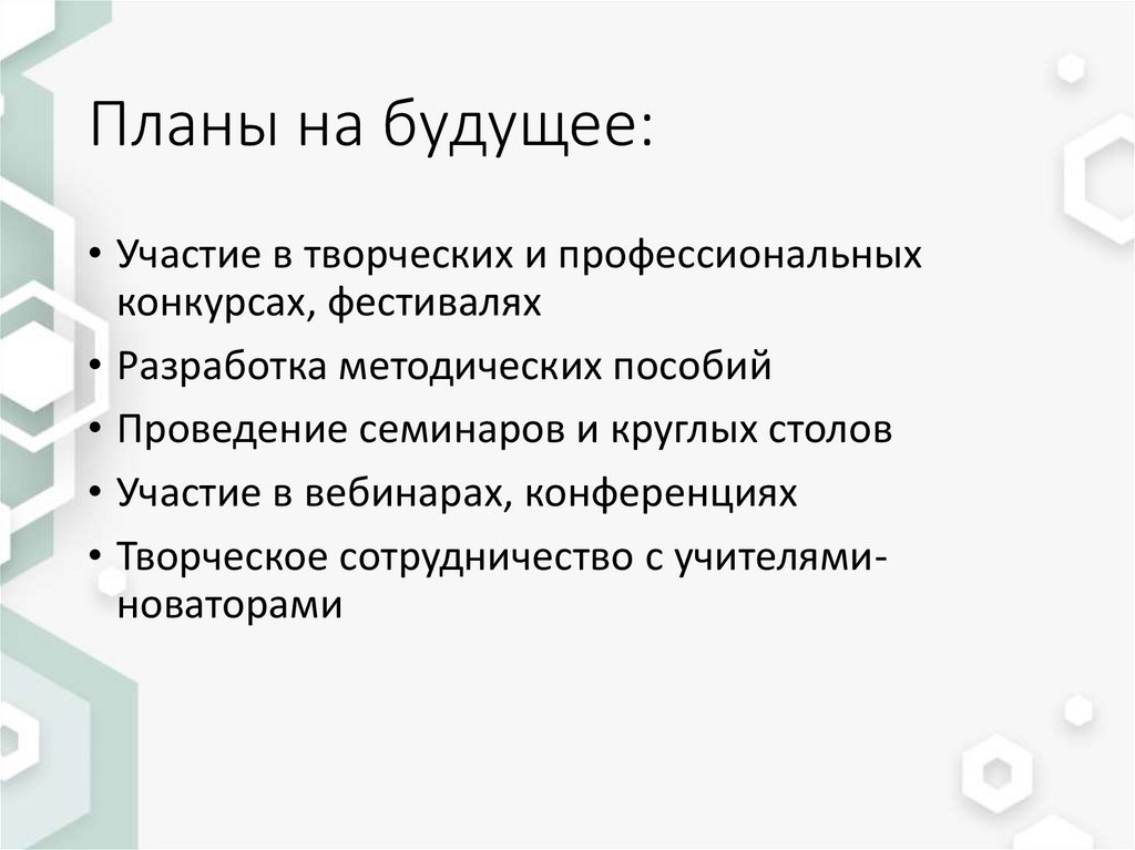 Планы на будущее:• Участие в творческих и профессиональных