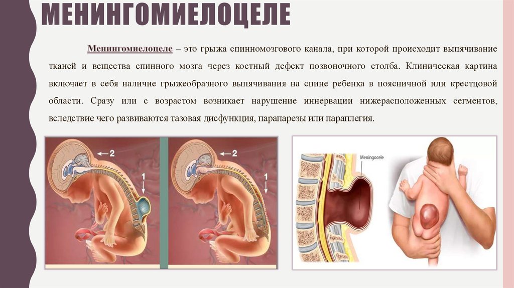 включает в себя наличие грыжеобразного выпячивания на спине ребенка в поясничной или крестцовой