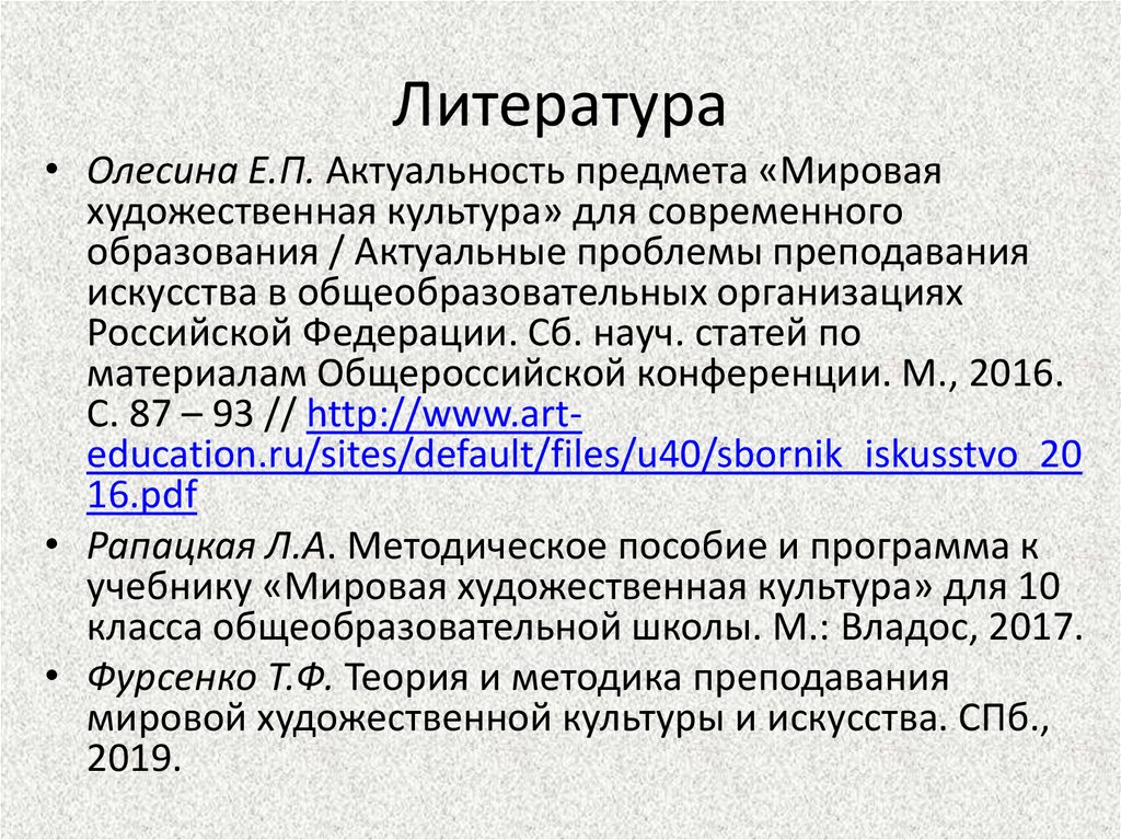 Литература• Олесина Е.П. Актуальность предмета «Мировая