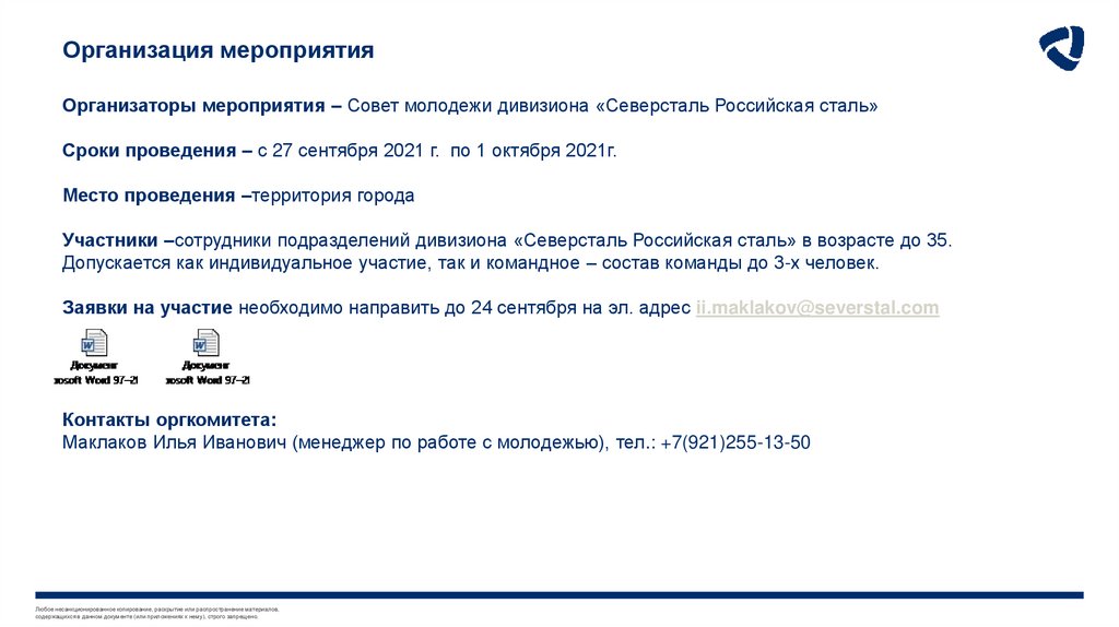 Организация мероприятияОрганизаторы мероприятия – Совет молодежи дивизиона «Северсталь Российская сталь»