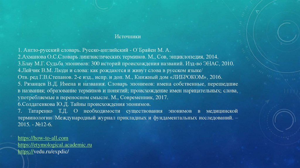 Источники1. Англо-русский словарь. Русско-английский - О`Брайен М. А.
