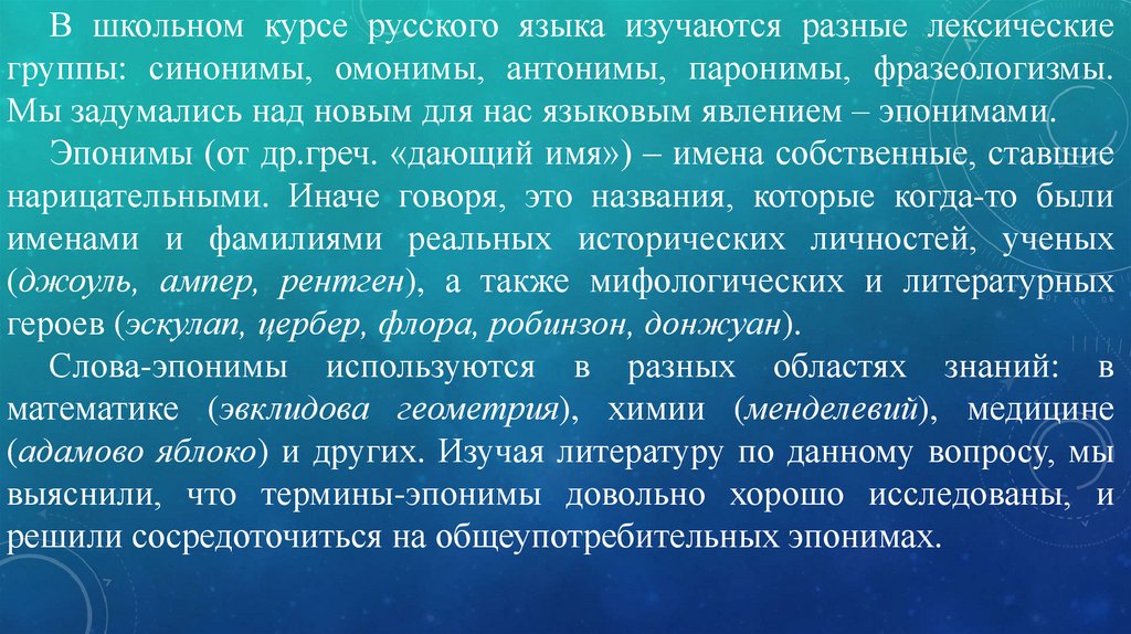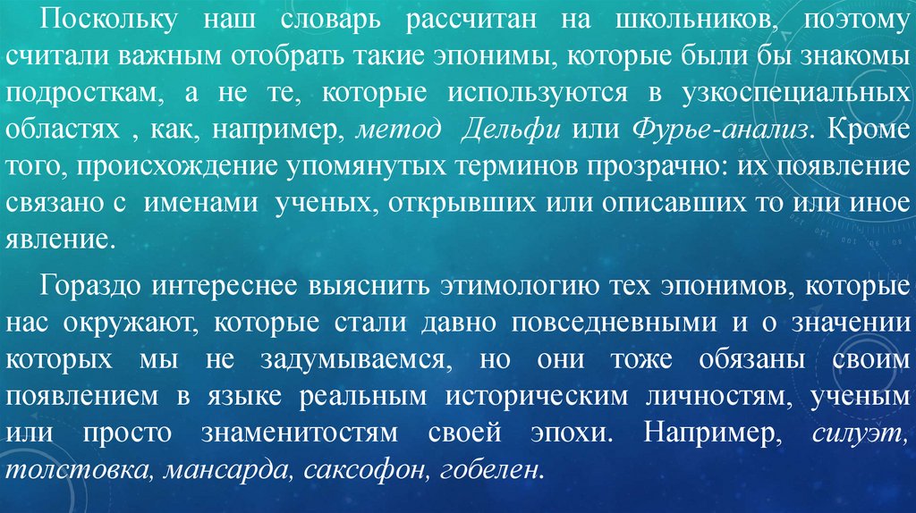 Поскольку наш словарь рассчитан на школьников, поэтомусчитали важным отобрать такие эпонимы, которые были бы знакомы