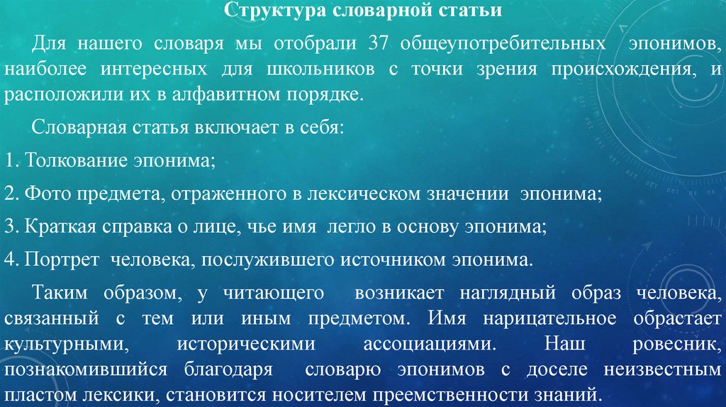 Структура словарной статьиДля нашего словаря мы отобрали 37 общеупотребительных эпонимов,
