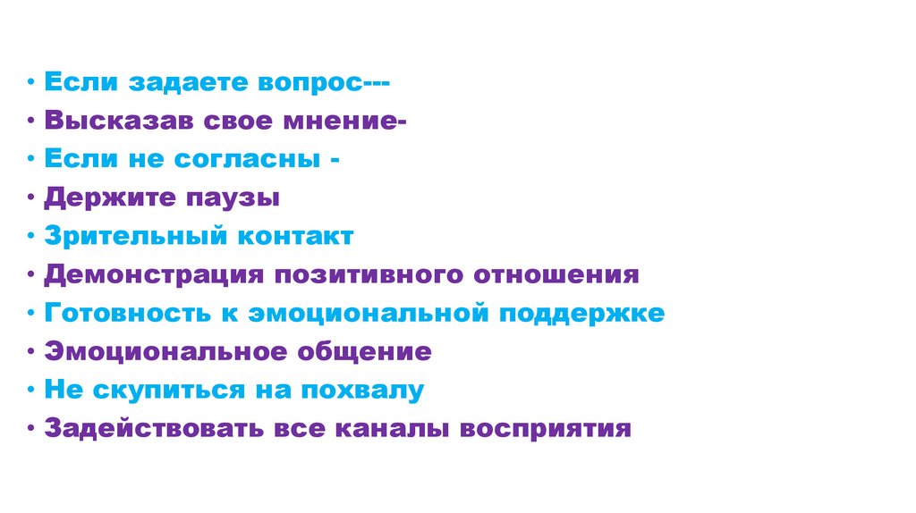 • Если задаете вопрос--• Высказав свое мнение• Если не согласны • Держите паузы• Зрительный контакт