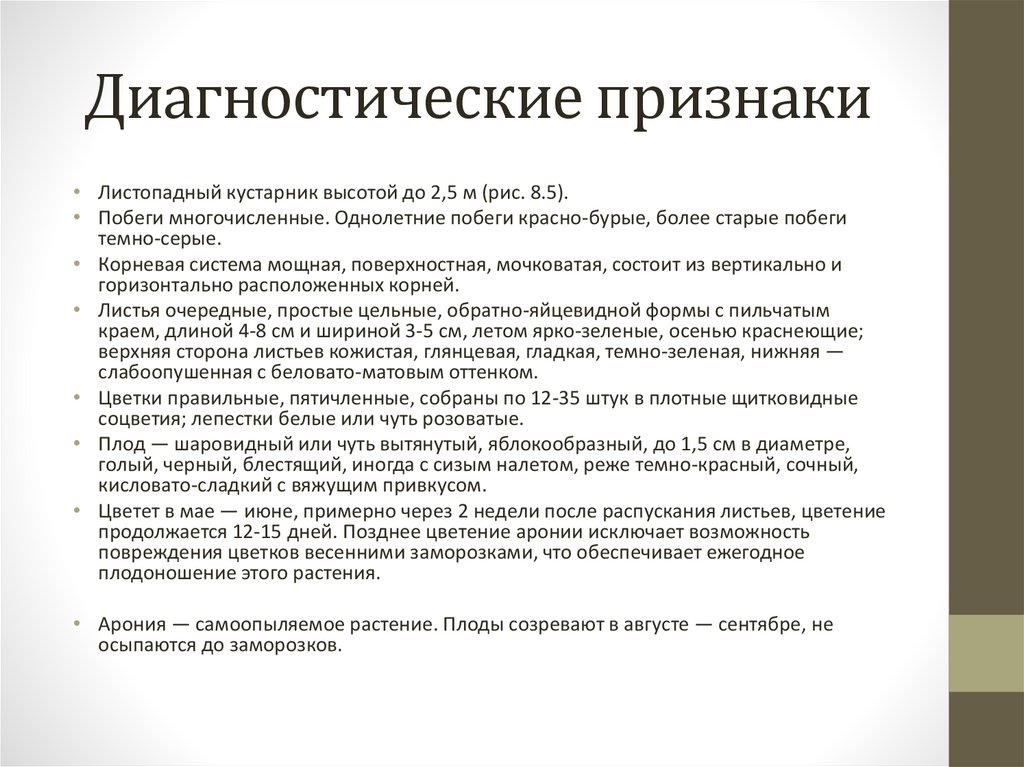 • Арония — самоопыляемое растение. Плоды созревают в августе — сентябре, не