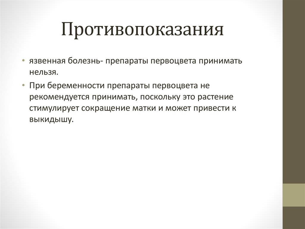 Противопоказания• язвенная болезнь- препараты первоцвета принимать