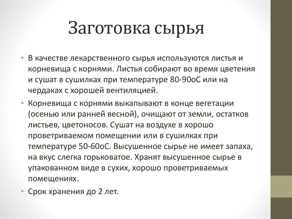 Заготовка сырья• В качестве лекарственного сырья используются листья и