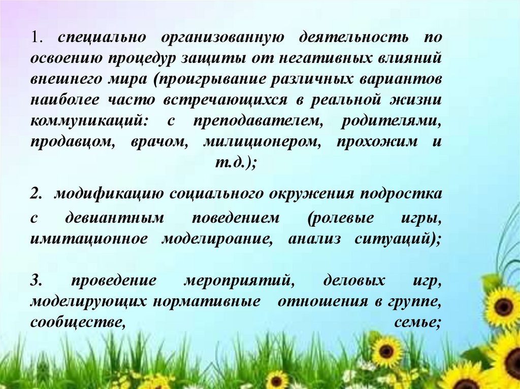1. специально организованную деятельность поосвоению процедур защиты от негативных влияний
