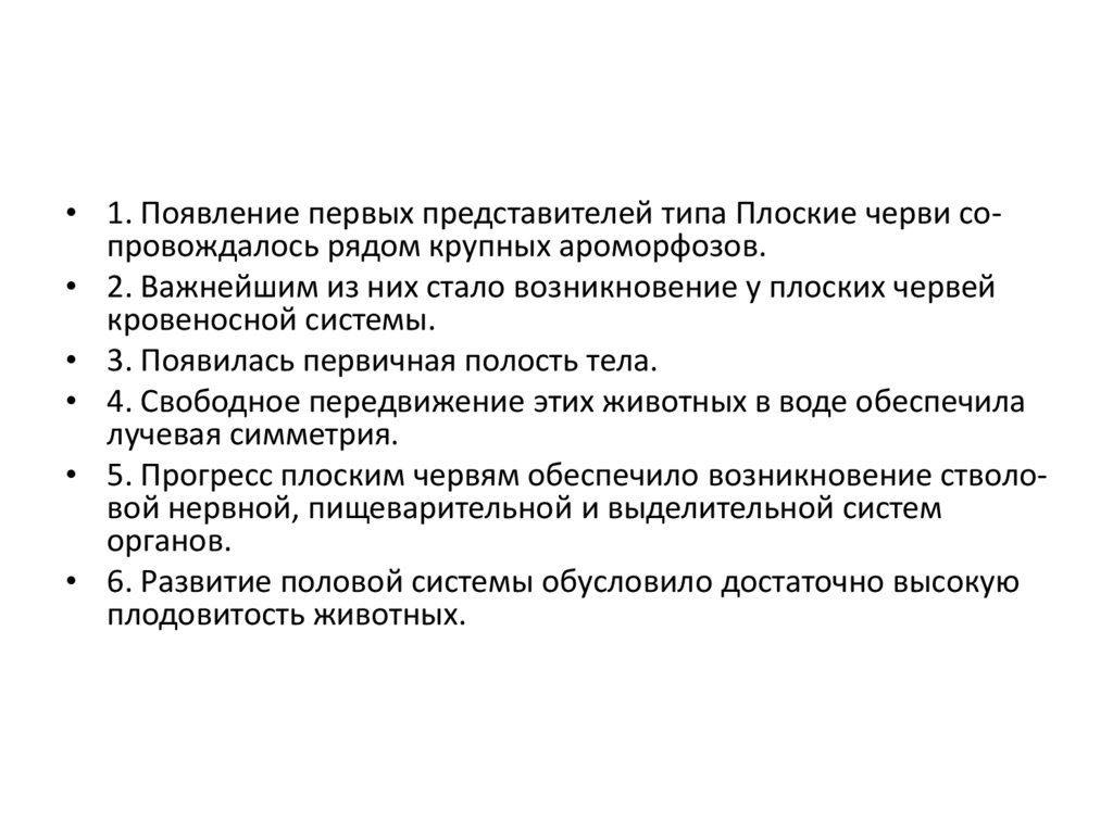 • 1. Появление первых представителей типа Плоские черви сопровождалось рядом крупных ароморфозов.• 2. Важнейшим из них стало возникновение у плоских червей