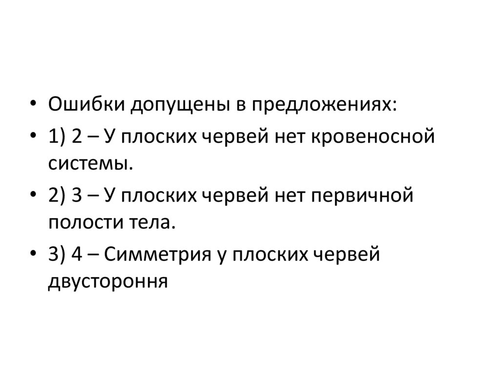 • Ошибки допущены в предложениях:• 1) 2 – У плоских червей нет кровеносной