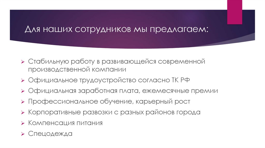 Для наших сотрудников мы предлагаем:Стабильную работу в развивающейся современной