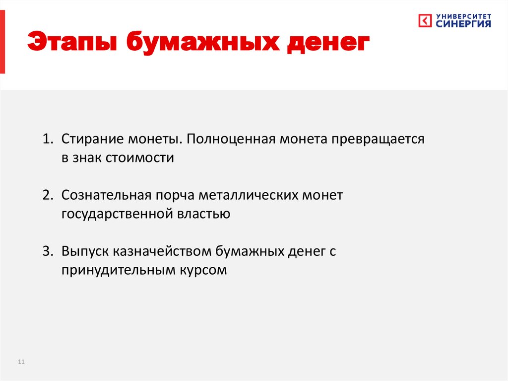 Этапы бумажных денег1. Стирание монеты. Полноценная монета превращается