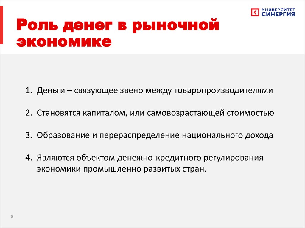 • Роль денег в рыночной экономике