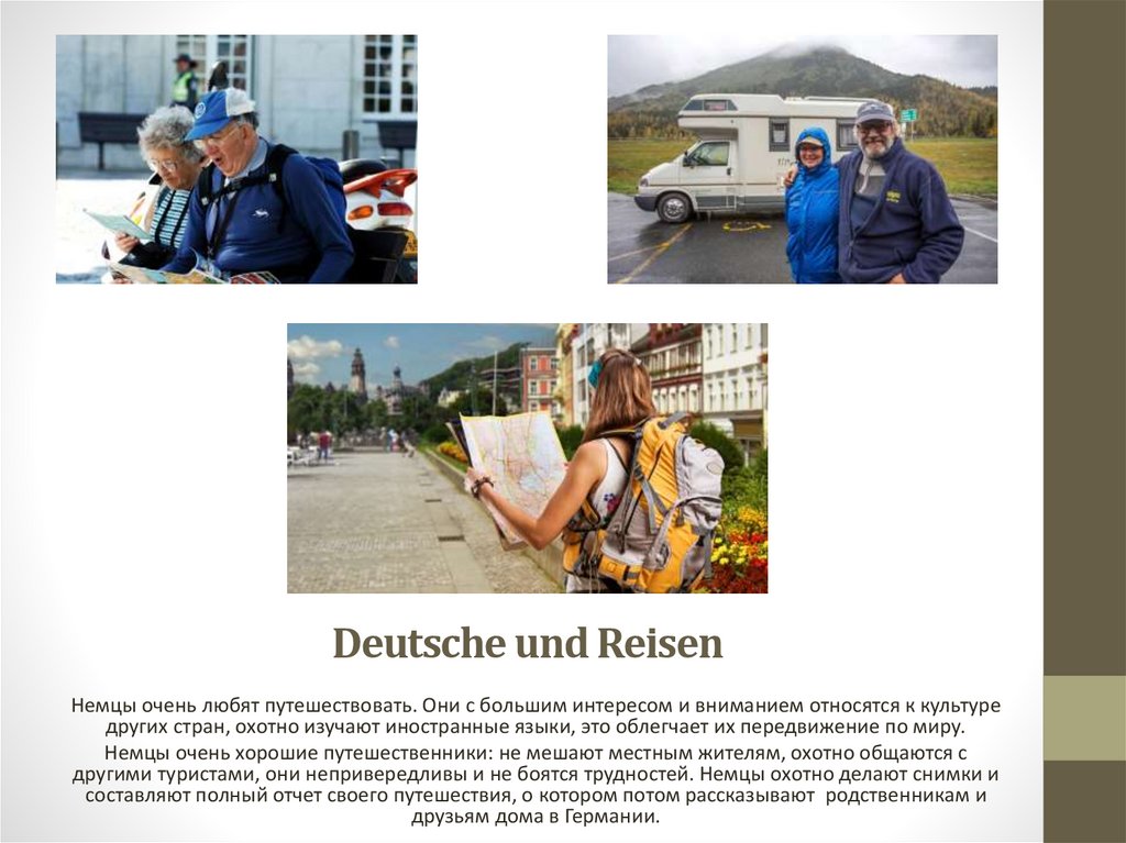 Deutsche und ReisenНемцы очень любят путешествовать. Они с большим интересом и вниманием относятся к культуре