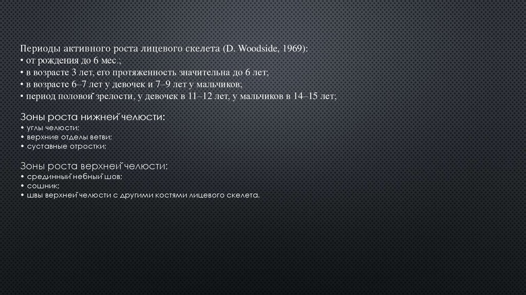 Периоды активного роста лицевого скелета (D. Woodside, 1969):• от рождения до 6 мес.;