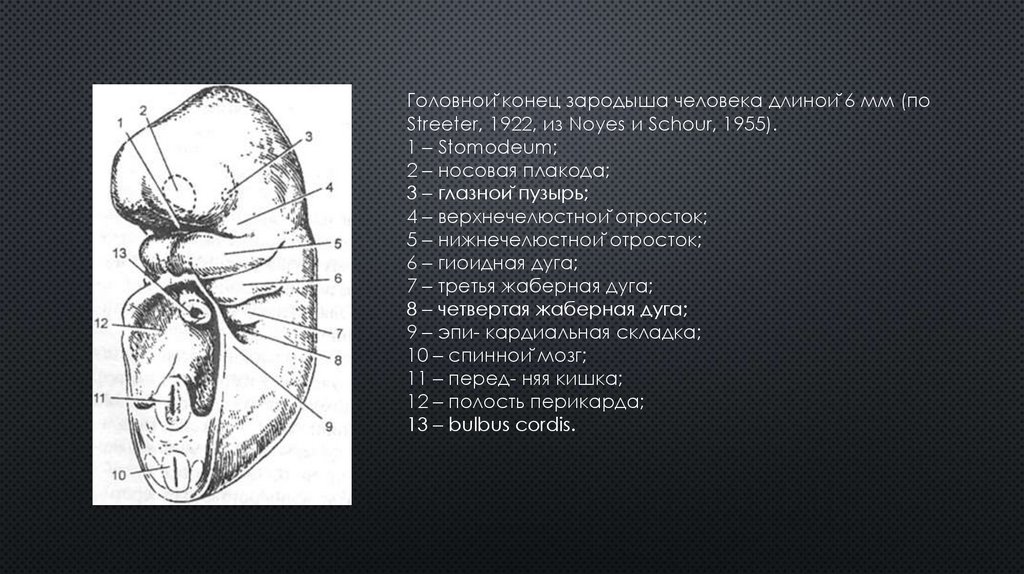 Головной конец зародыша человека длиной 6 мм (поStreeter, 1922, из Noyes и Schour, 1955).