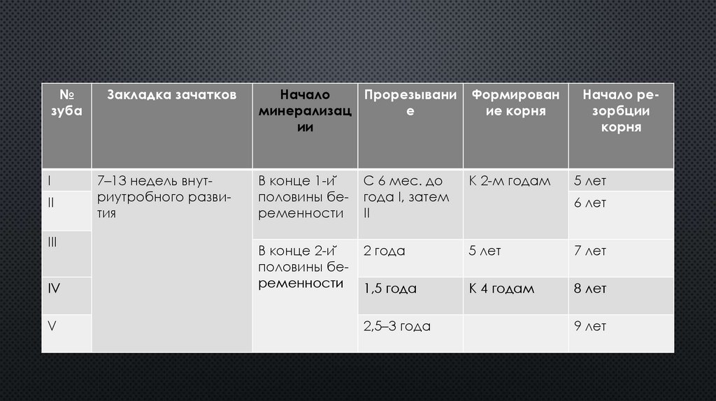 Прорезывание V зубов, окончание формирования корней I, II. Закладка фолликула и начало