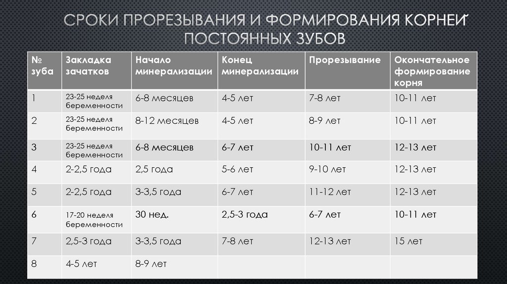 Окончание формирования коронок 4-х зубов, начало физиологической резорб- ции 1-х зубов.