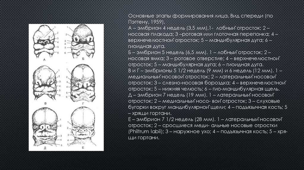 Основные этапы формирования лица. Вид спереди (поПэттену, 1959).