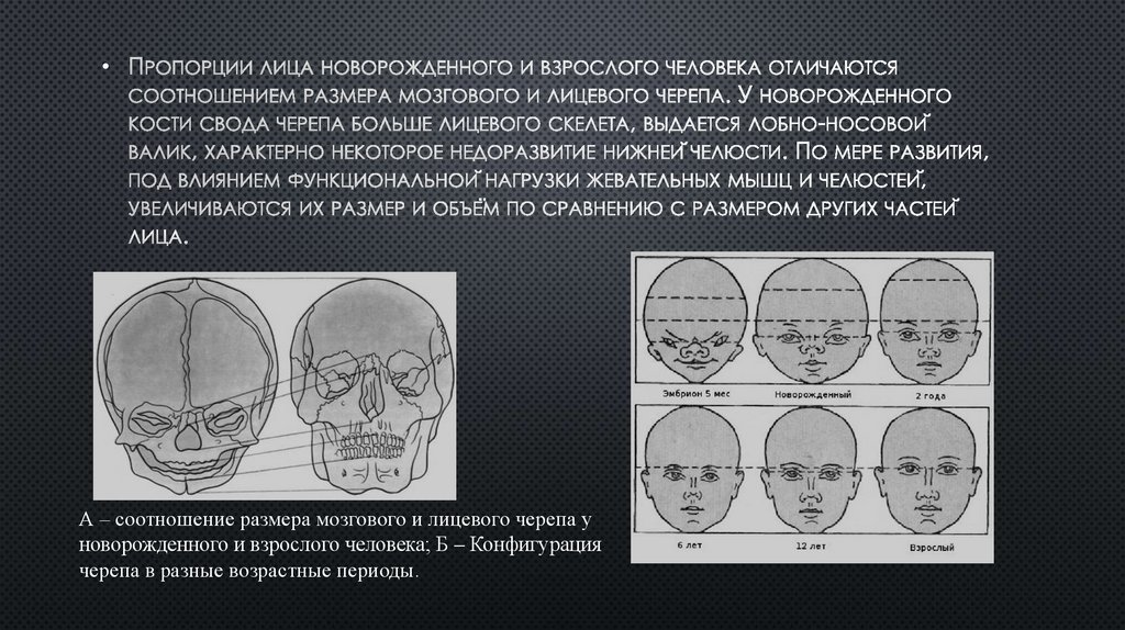 А – соотношение размера мозгового и лицевого черепа у