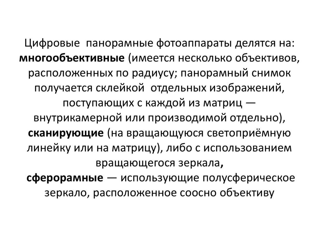 Цифровые панорамные фотоаппараты делятся на:многообъективные (имеется несколько объективов,