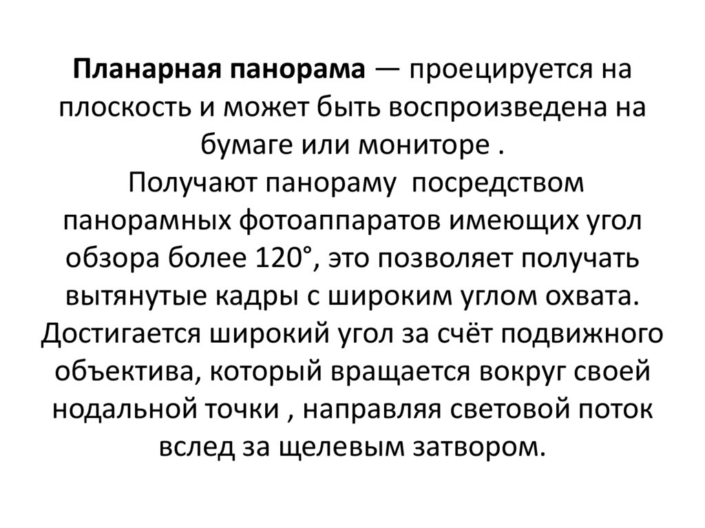 Планарная панорама — проецируется наплоскость и может быть воспроизведена на