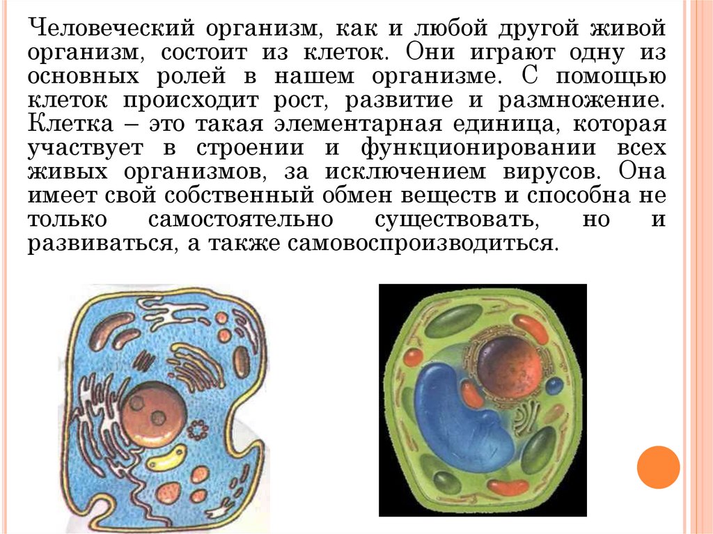 Человеческий организм, как и любой другой живойорганизм, состоит из клеток. Они играют одну из