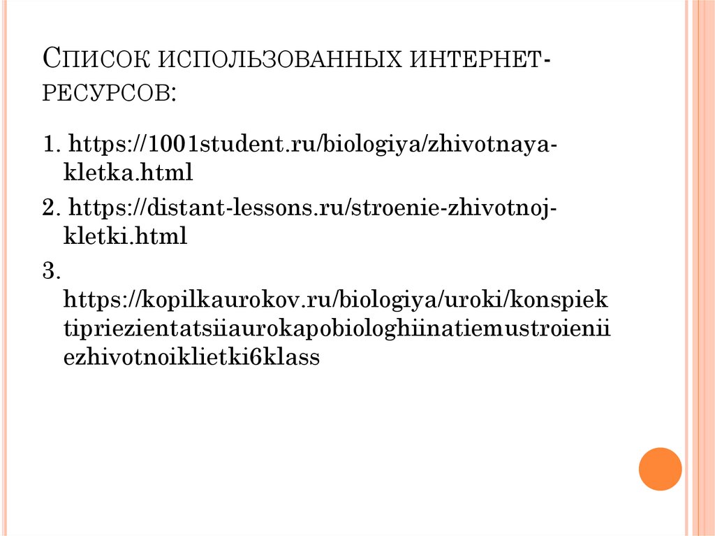 СПИСОК ИСПОЛЬЗОВАННЫХ ИНТЕРНЕТРЕСУРСОВ:1. https://1001student.ru/biologiya/zhivotnayakletka.html