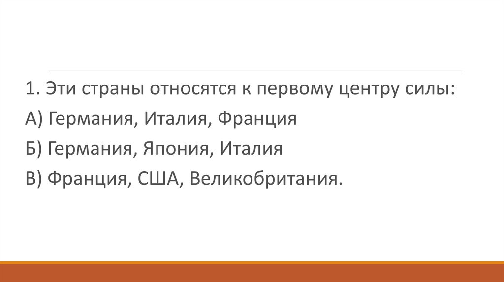 1. Эти страны относятся к первому центру силы:А) Германия, Италия, Франция