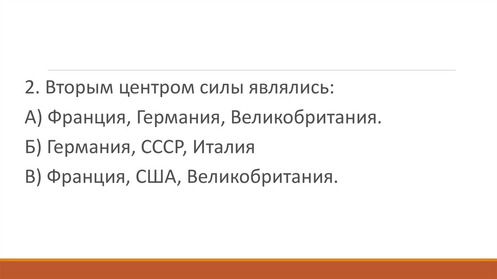 2. Вторым центром силы являлись:А) Франция, Германия, Великобритания.