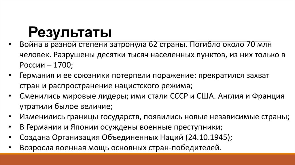 Результаты• Война в разной степени затронула 62 страны. Погибло около 70 млн