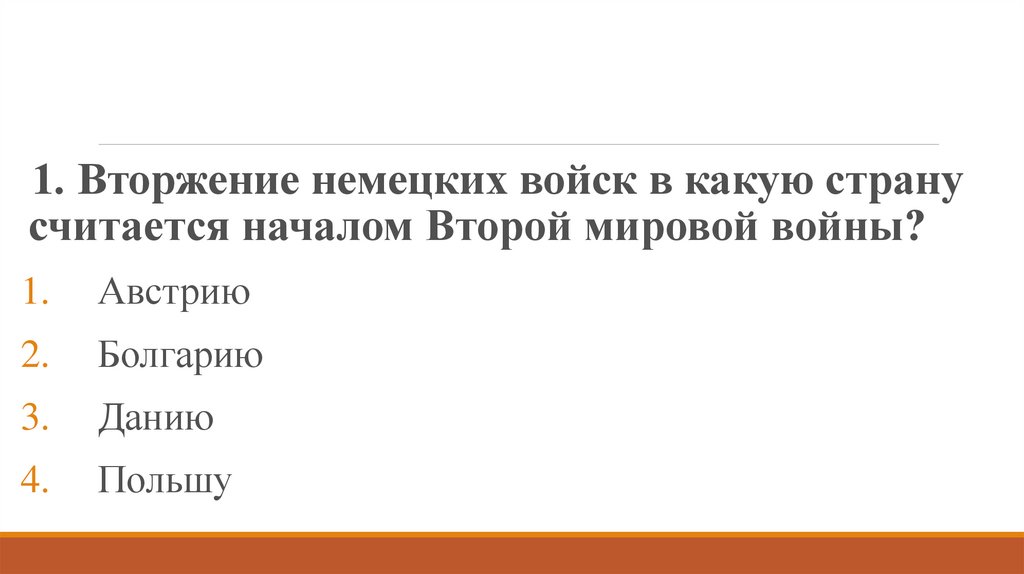 1. Вторжение немецких войск в какую странусчитается началом Второй мировой войны?
