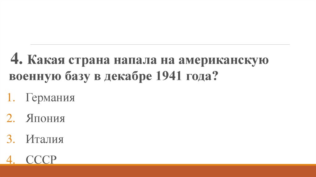 4. Какая страна напала на американскуювоенную базу в декабре 1941 года?