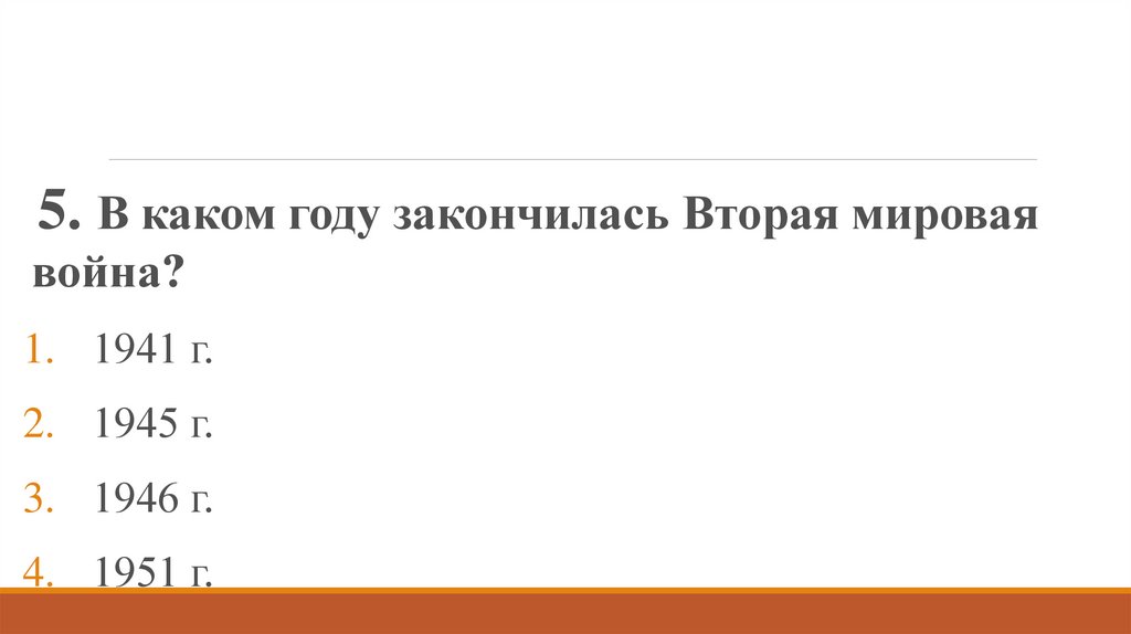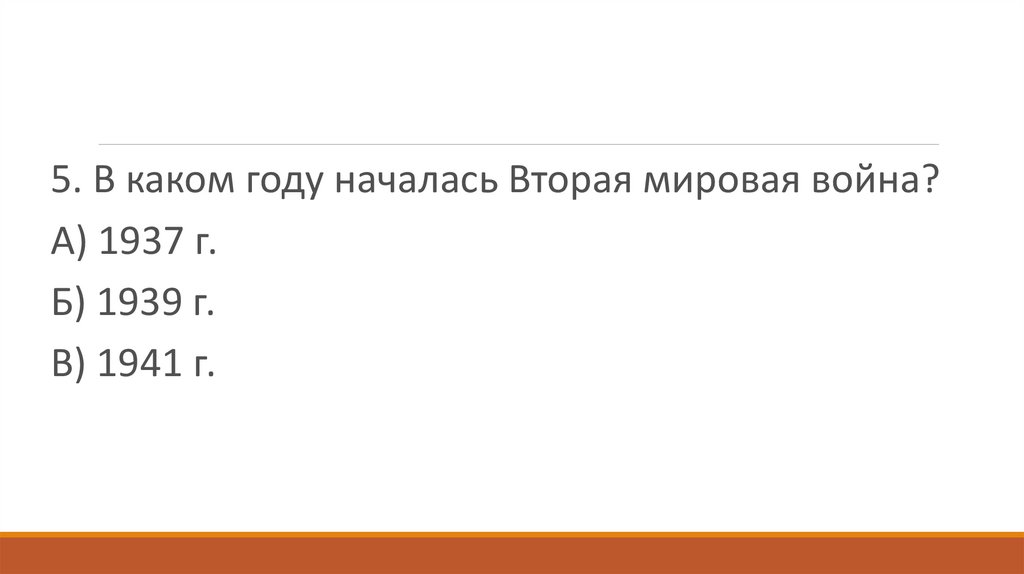 5. В каком году началась Вторая мировая война?А) 1937 г.