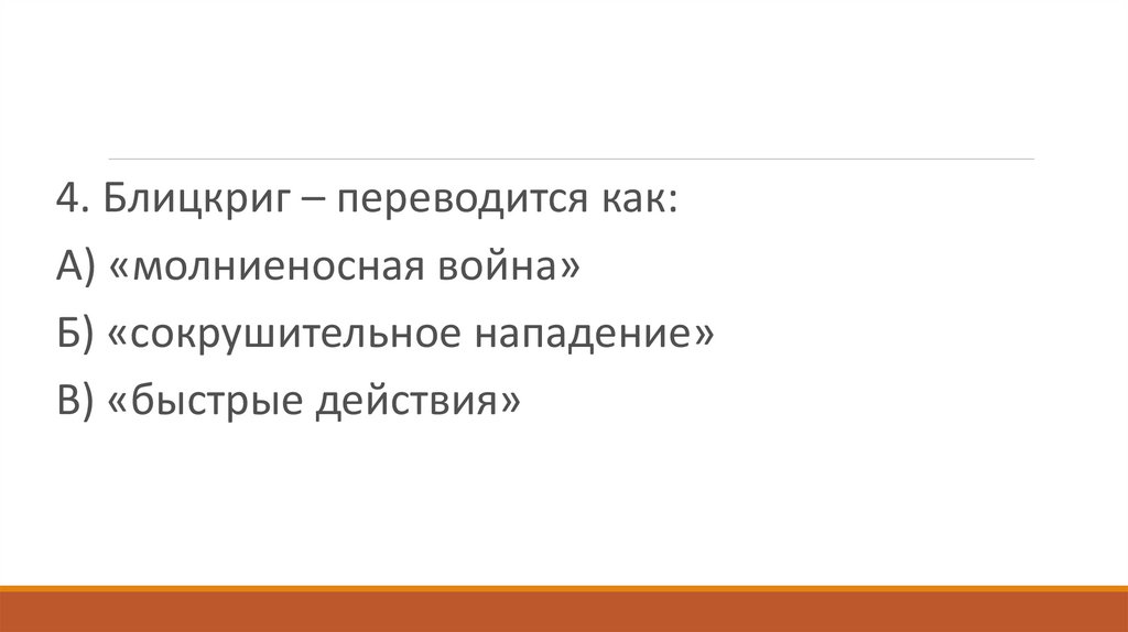 4. Блицкриг – переводится как:А) «молниеносная война»