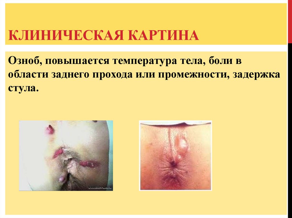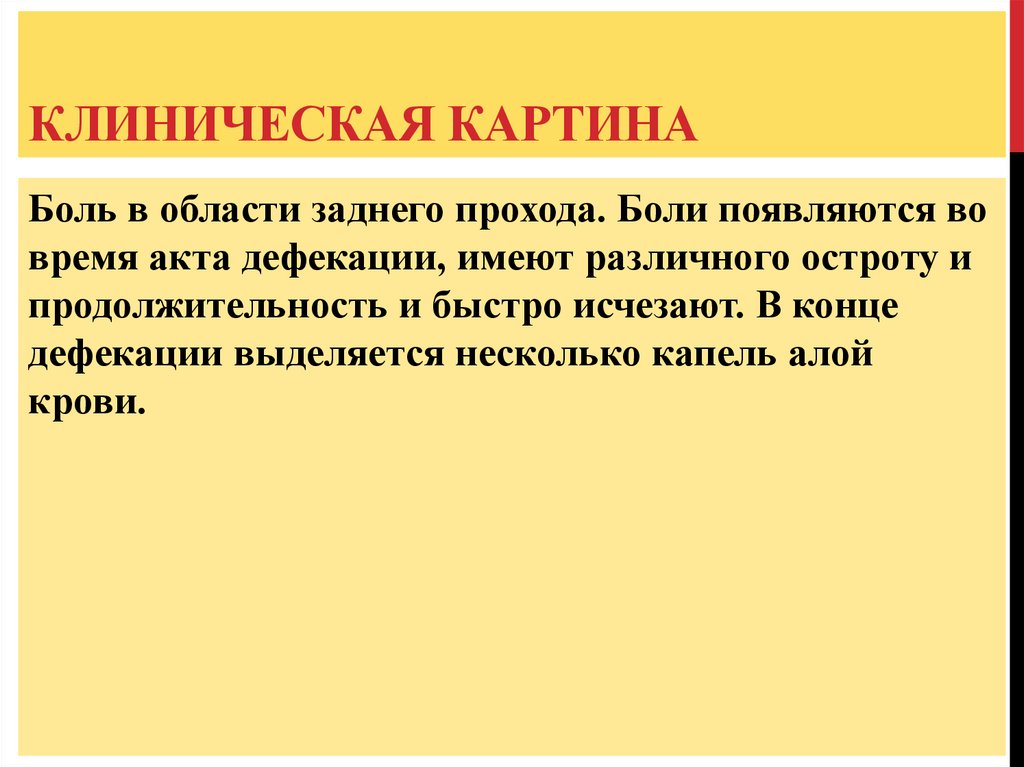 КЛИНИЧЕСКАЯ КАРТИНАБоль в области заднего прохода. Боли появляются во