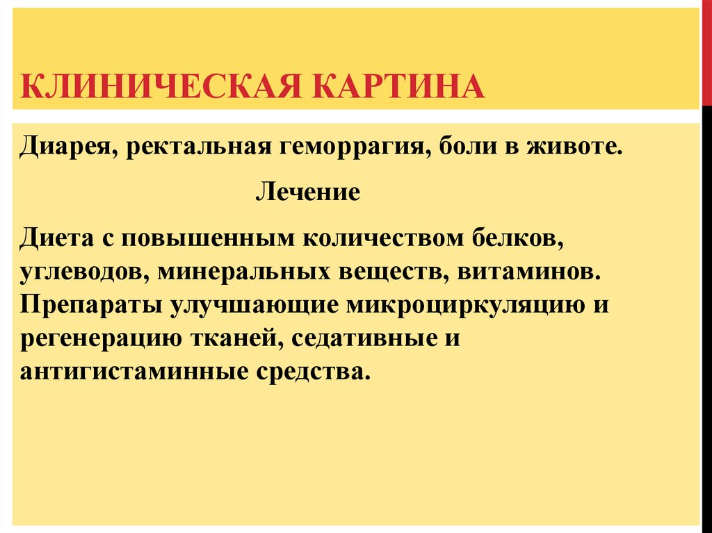 КЛИНИЧЕСКАЯ КАРТИНАДиарея, ректальная геморрагия, боли в животе.
