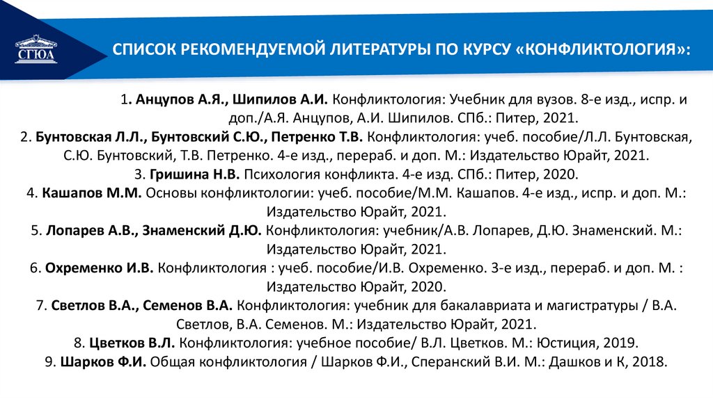 1. Анцупов А.Я., Шипилов А.И. Конфликтология: Учебник для вузов. 8-е изд., испр. и