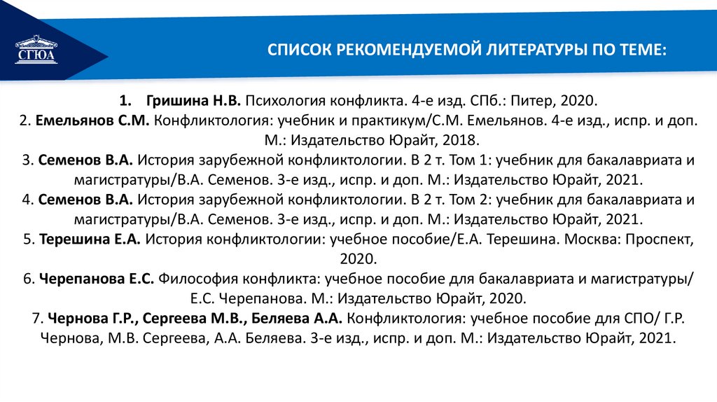 1. Гришина Н.В. Психология конфликта. 4-е изд. СПб.: Питер, 2020.