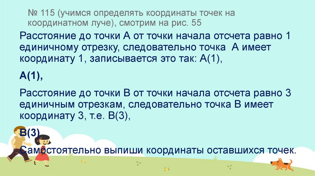 № 115 (учимся определять координаты точек накоординатном луче), смотрим на рис. 55