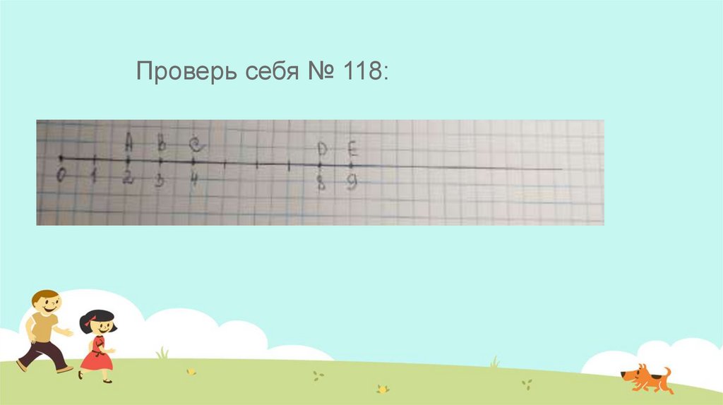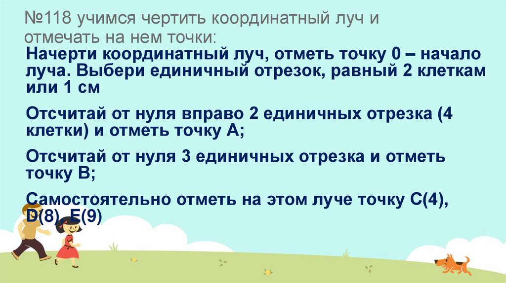 №118 учимся чертить координатный луч иотмечать на нем точки: