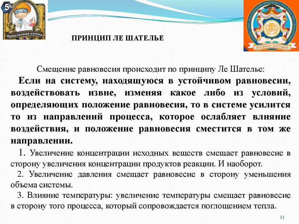 ПРИНЦИП ЛЕ ШАТЕЛЬЕСмещение равновесия происходит по принципу Ле Шателье: