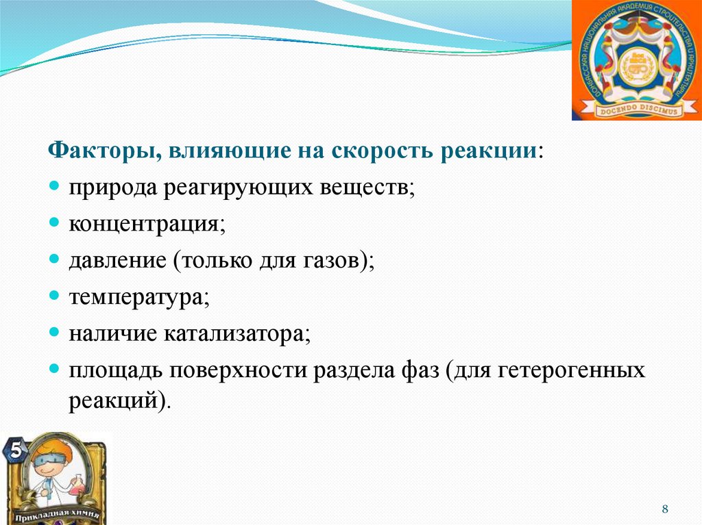 Факторы, влияющие на скорость реакции:природа реагирующих веществ;